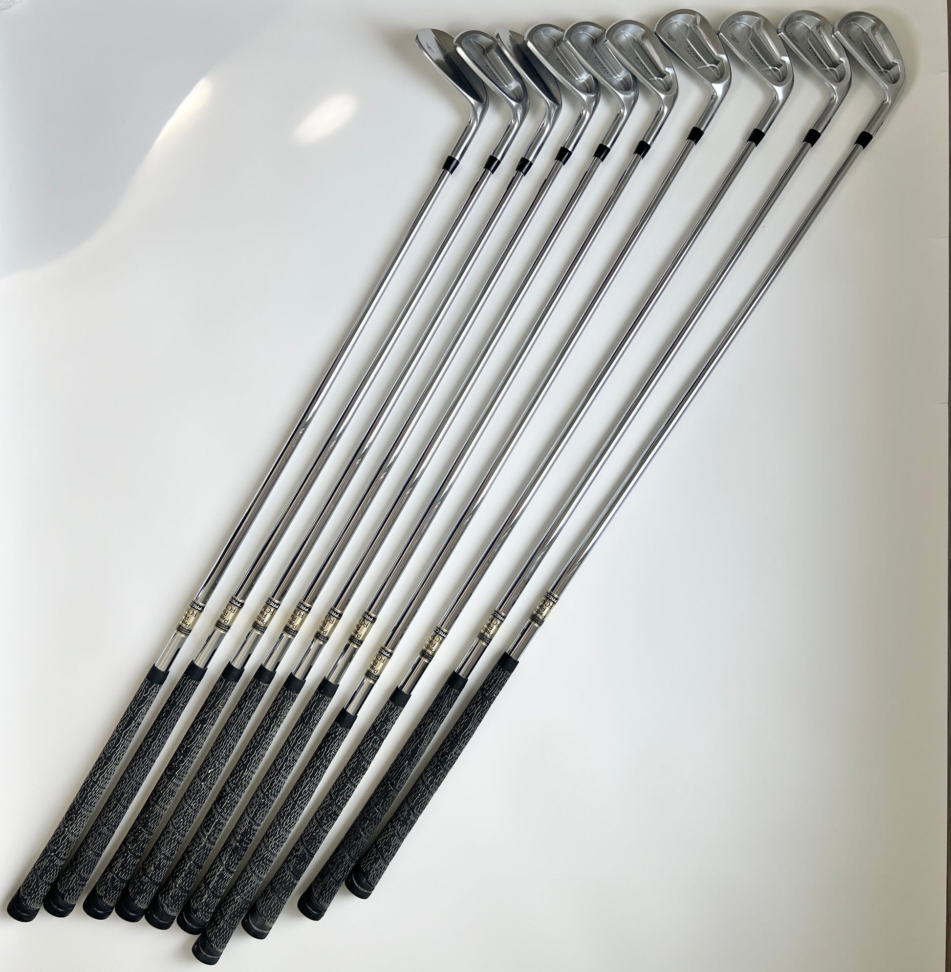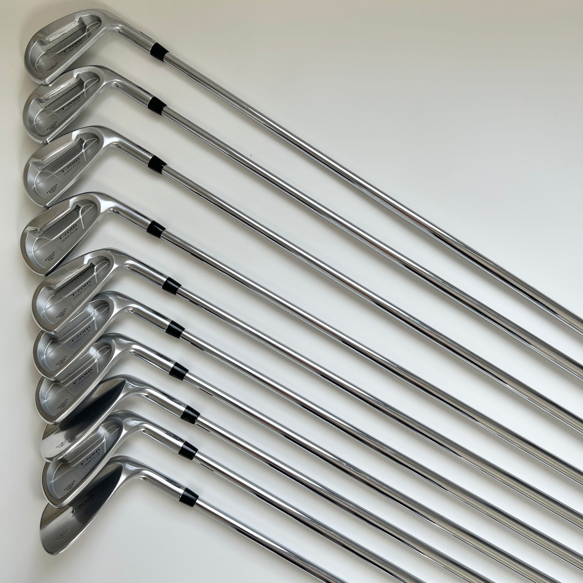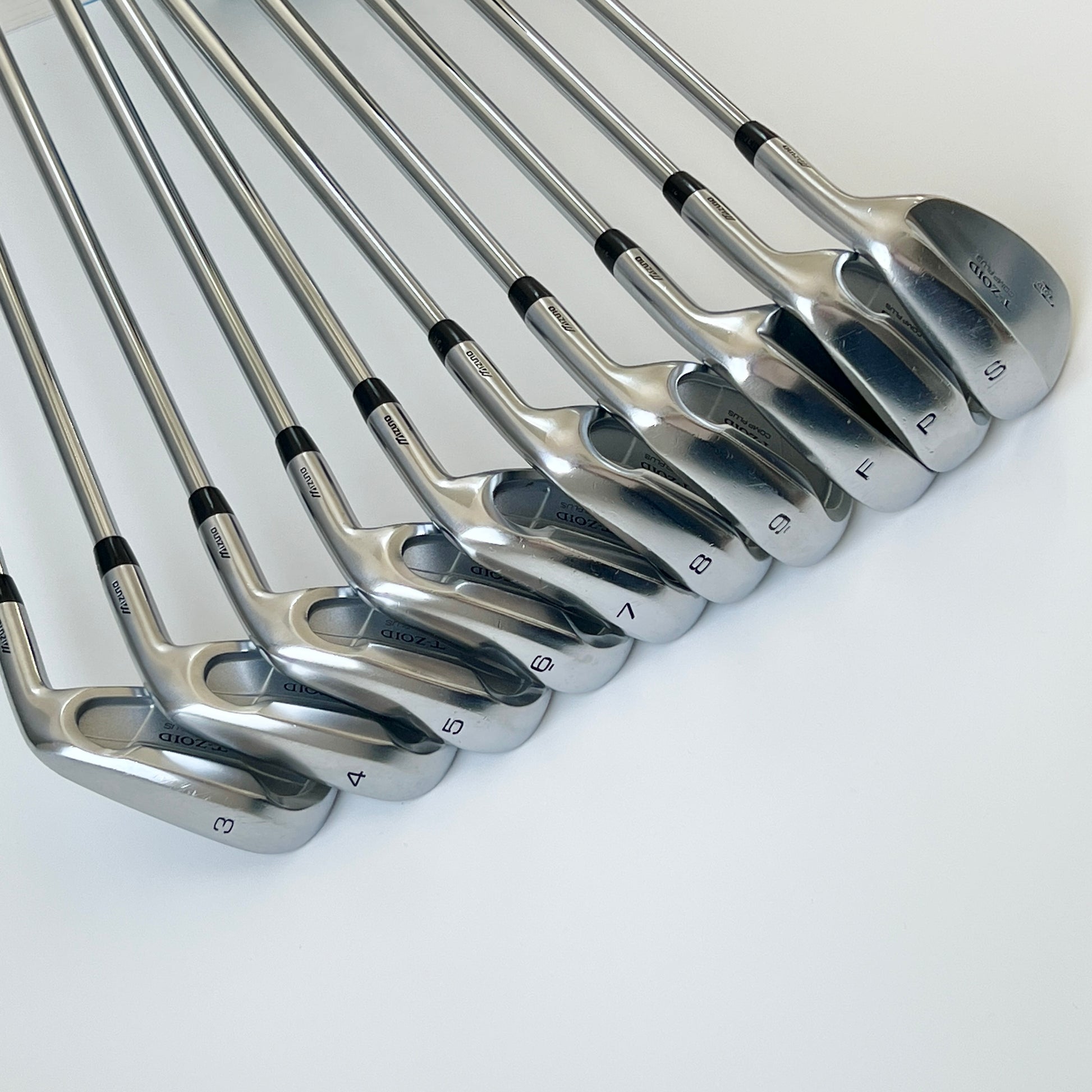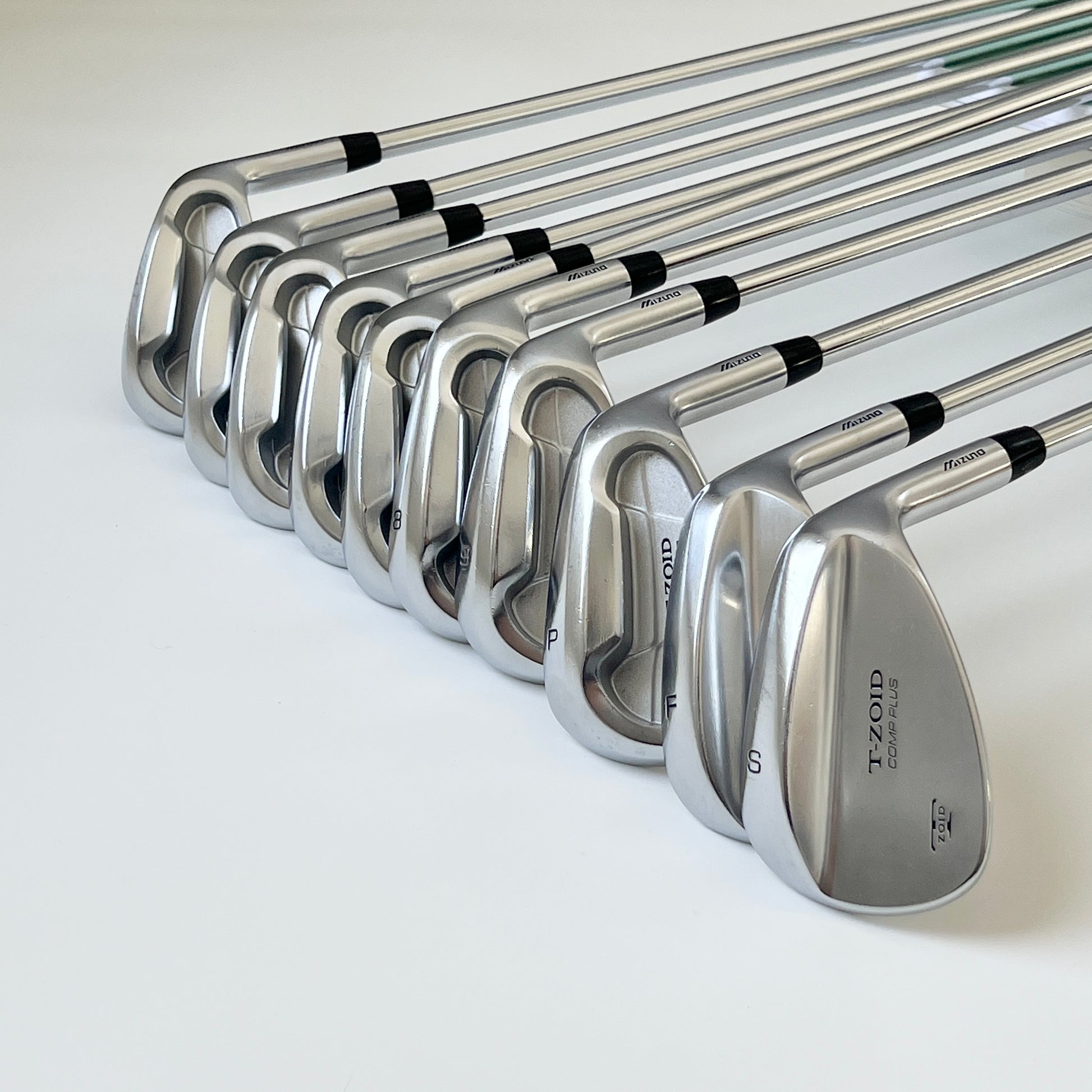 這組 MIZUNO T-ZOID COMP PLUS 鐵桿套組 包含 完整 10 支桿號:#3-9, S, P, F,桿號齊全,非常適合希望擁有全套鐵桿的球友。